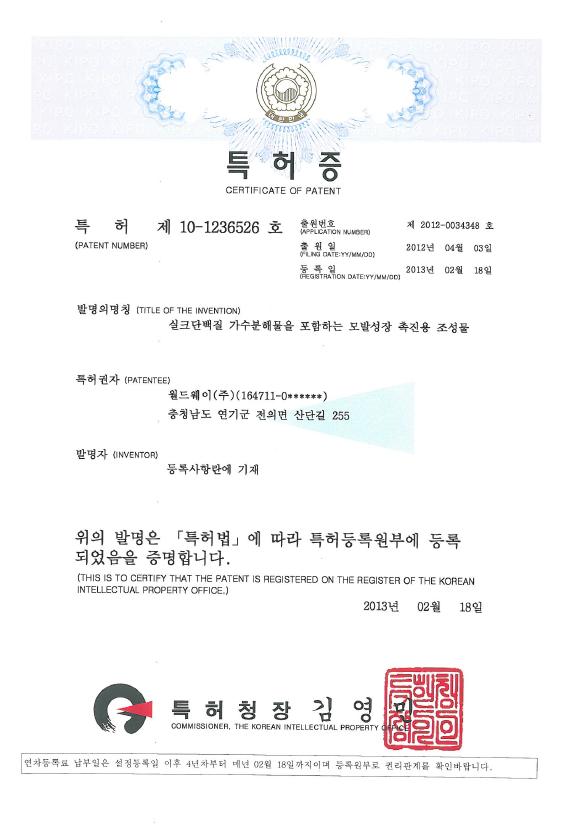 [주요 5대 특허] 실크단백질 가수분해물을 포함하는 모발성장 촉진용 조성물