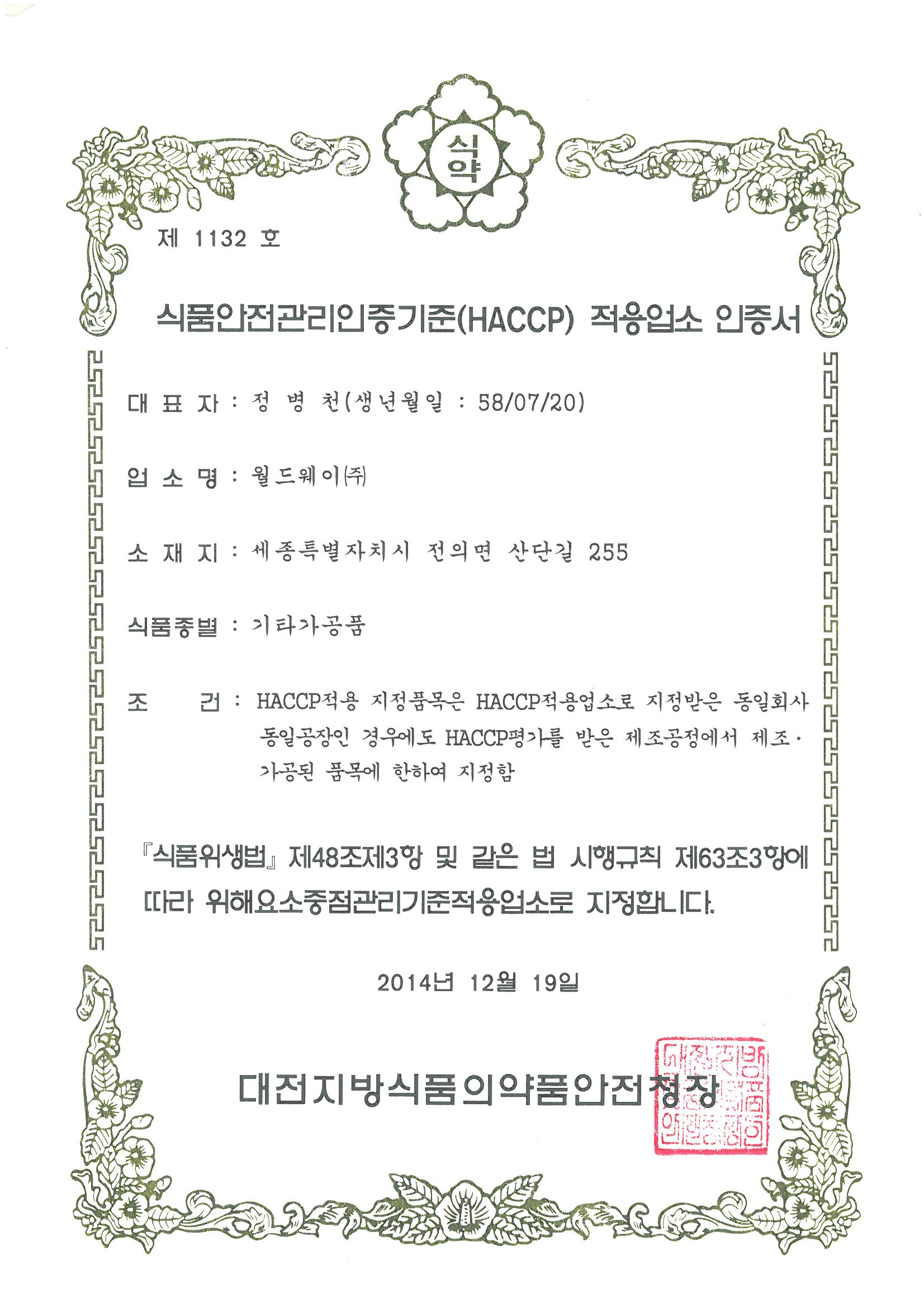 [인증현황] 식품안전관리 기준서(HACCP)